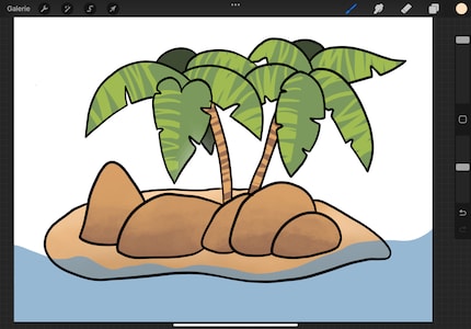 To select a brush, tap on the brush icon. Take the "6B pencil" from the "Draw" category. I always use this for sketching. It behaves most like my analogue pencils. Now use a darker grey to draw the template for your palm island. First the shape of the island, two palm trees with a few leaves on all sides and a few stones scattered on the ground. Just as you feel. I've kept the shapes as simple as possible for this course.
