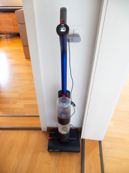 Pour mon parquet, je verse un peu de produit d’entretien spécial planchers dans le réservoir d’eau propre et passe dans tout l’appartement. Dans la chambre et le salon, j’ai suffisamment de marge de manœuvre pour nettoyer partout avec le côté gauche le long du mur et atteindre les coins. Je n’utilise que la moitié du réservoir, car le niveau économiseur d’eau suffit. Le nettoyeur ne laisse même pas de taches d’eau. D’après Dyson, un réservoir plein suffit pour une surface de 290 m²… dans la mesure où cela ne dure pas plus de 35 minutes.